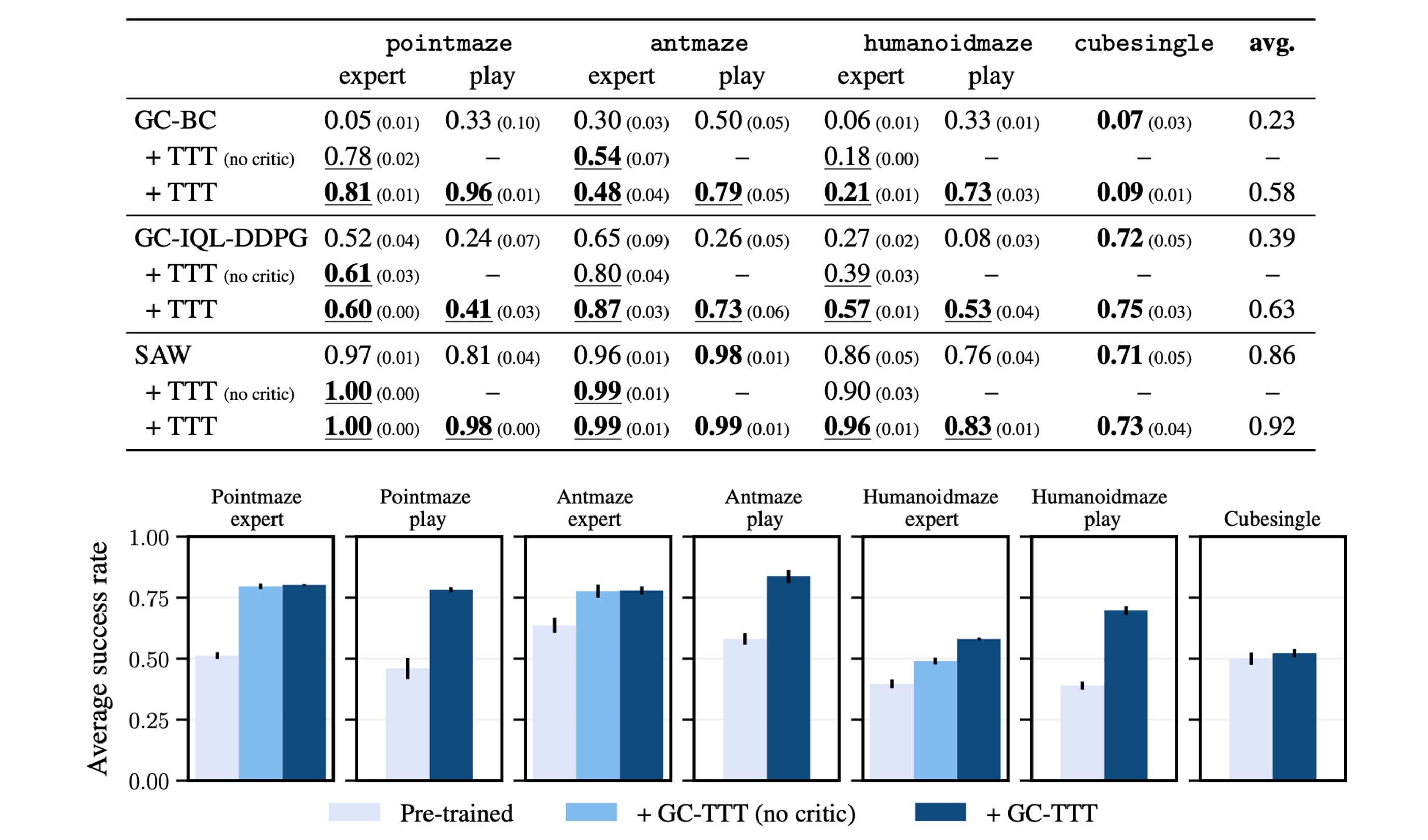 We evaluated GC-TTT on a range of loco-navigation (pointmaze, antmaze, humanoidmaze) and manipulation (cubesingle) tasks from OGBench. As shown in Table 1, GC-TTT provides substantial improvements when applied on top of various offline RL backbones (GC-BC, GC-IQL, and SAW). On average, GC-TTT improved the success rate of GC-BC from 0.23 to 0.58 (+152.2%) and GC-IQL from 0.39 to 0.63 (+61.5%).