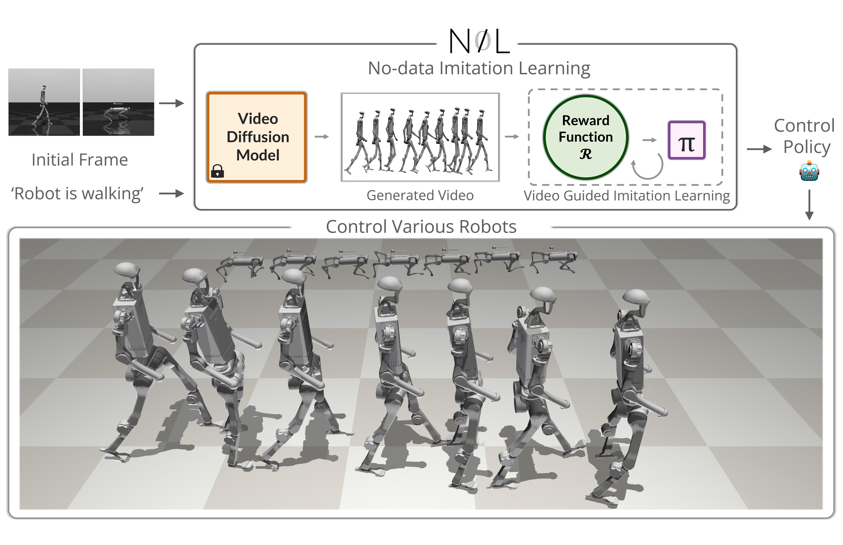Acquiring physically plausible motor skills across diverse and unconventional morphologies—including humanoid robots, quadrupeds, and animals—is essential for advancing character simulation and robotics. Traditional methods, such as reinforcement learning (RL) are task- and body-specific, require extensive reward function engineering, and do not generalize well. Imitation learning offers an alternative but relies heavily on high-quality expert demonstrations, which are difficult to obtain for non-human morphologies. Video diffusion models, on the other hand, are capable of generating realistic videos of various morphologies, from humans to ants. Leveraging this capability, we propose a data-independent approach for skill acquisition that learns 3D motor skills from 2D-generated videos, with generalization capability to unconventional and non-human forms. Specifically, we guide the imitation learning process by leveraging vision transformers for video-based comparisons by calculating pair-wise distance between video embeddings. Along with video-encoding distance, we also use a computed similarity between segmented video frames as a guidance reward. We validate our method on locomotion tasks involving unique body configurations. In humanoid robot locomotion tasks, we demonstrate that ``No-data Imitation Learning" (NIL) outperforms baselines trained on 3D motion-capture data. Our results highlight the potential of leveraging generative video models for physically plausible skill learning with diverse morphologies, effectively replacing data collection with data generation for imitation learning.